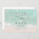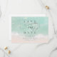 Romantic coastal themed wedding save the dates features beautiful turquoise abstract watercolor sparkling ocean wave and beach background, toped with stylish script and elegant font event details, modern and simple, great for sand beach wedding, tropical destination wedding, coastal ocean themed wedding.