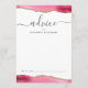 This elegant design features top and bottom borders of pink watercolor agate trimmed with gold faux glitter. The word "advice" appears in handwriting calligraphy script with flourishes at the beginning and end. Personalize with the names of the newlyweds in charcoal gray copperplate font. A line at the bottom provides space for guests to sign their advice and wishes for the couple.