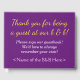 This plain bed-and-breakfast visitor book features a message like "Thank you for being a guest at our b & b!", and a message like "Please sign our guestbook! We’d love to always remember your visit!", along with a bed-and-breakfast name that can be personalized. It could be used to record messages and memories from the guests at a bed & breakfast.