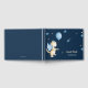 Complement your baby shower party with a this book where your guests can write the best wishes for the little baby. It has an illustration of a baby dragon holding a blue balloon on a dark blue background with blue stars and yellow suns. Illustrated and designed by Patricia Alvarez.