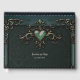 Elegant and romantic vintage design. The dark green vintage background gives the design a timeless touch, while the ornate frame harmoniously encloses the overall image. A large emerald green heart adorned with delicate gold accents and embedded in a decorative flourish symbolizes the couple's love and connection. The main focus is on the artfully designed silhouette of a bride and groom united in a graceful dance.
