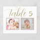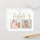 Elegant and unique custom wedding table number cards feature childhood photos of the bride and groom at an age that corresponds with the table number. To customize: type in the table number, click "change" by the default photos to upload your own digital or scanned photos, and add that individual table number card to your shopping cart. Repeat for all of the table numbers that you need.