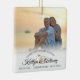 Create an elegant commemorative wedding anniversary keepsake holiday ornament featuring one or two photos of the couple and personalized with your custom text (the sample says CELEBRATING # YEARS TOGETHER), an elegant calligraphy script font for the couple's names accented with wedding rings and their wedding date and anniversary date. Makes a meaningful anniversary or holiday gift for the couple celebrating a special or milestone anniversary. For modifications or assistance, contact the designer BEFORE ORDERING via Zazzle Chat or makeitaboutyoustore@gmail.com.