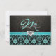 Elegant Aqua Blue and Black Damask with Diamonds Monogram wedding RSVP Cards.