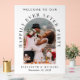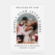 Elégant panneau de réception de mariage en acrylique blanc avec votre photo présentée dans un cadre d'arche chic, "Bienvenue à notre Happily Ever After Party" dans la typographie serif simple et classique, ainsi que vos noms et date de réception.