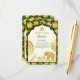 This elegant Hindu wedding enclosure card features a rich emerald green background with a marigold floral pattern and an ivory moghul arch. Intricate gold details of lotus, peacock, elephant, and an Om symbol frame your personalized details, perfect for sharing additional wedding information with your guests in a luxurious and traditional design.