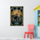 A sophisticated blend of nature and 1920s skyscraper architecture. This striking illustration features a bold black silhouette of a maple tree, its leaves forming a perfect canopy against a radiant gold sunburst. The tree rises from an intricate, tiered Art Deco base in warm orange and gold tones, framed by a majestic teal geometric archway. This opulent piece is perfect for adding a touch of Gatsby-era glamour to a modern office, study, or luxury living room.