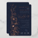 This wedding invitation showcases a rich navy blue background with flowing rose gold floral illustrations, creating a timeless and luxurious look. The elegant script font paired with classic serif text strikes a balance between modern romance and refined sophistication. Delicate metallic accents and a softly illustrated bee add a whimsical yet upscale touch, perfect for evening weddings or formal events with a romantic, botanical flair.