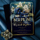 Elegant baroque style dark and moody blue and white floral "SURPRISE" birthday party design. Features dramatically elegant white lily of the valley flowers and dusky blue hawthorn flowers with lush dusky green greenery on a multi-tonal teal to darkest blue background. Add to this the luxury of real gold foil, and you have a birthday celebration that is at once sophisticated and timelessly elegant, but also dramatically modern.