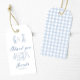 Express votre gratitude avec ces étiquettes cadeaux de remerciement pour une douche de printemps ou d'été pour bébé garçon, avec un délicieux motif bleu pastel en vichy inspiré d'un thème français.