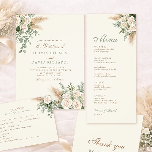 Create a beautifully coordinated wedding table setting with this elegant beige pampas grass wedding menu card. Featuring soft neutral tones, delicate ivory roses, and natural eucalyptus greenery, this design is perfect for boho, rustic, and minimalist wedding themes.