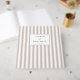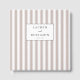 This elegant wedding guest book features a modern design with vertical stripes in shades of beige, creating a subtle yet sophisticated backdrop. The clean, sans-serif typography is centred within a white rectangular box, offering customizable space for names and dates. Gold confetti accents add a festive touch, enhancing the celebratory mood. Perfect for weddings, this guest book combines neutral tones with metallic highlights, making it an ideal choice for those seeking a refined and personalized keepsake.