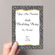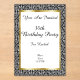 This Frosted acrylic Birthday Party invitation is black and white with a gold frame on an elegant damask pattern with fancy white scrolls. Customise all the text with the templates.