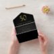 Elegant and chic black 50th birthday party all-in-one invitation featuring "Cheers to 50 Years," your name, invitation details and a tear-away RSVP response postcard written in classic serif typography and clean modern lettering, all rendered in your choice of genuine gold, silver or rose gold foil.