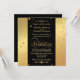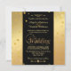 A stylish wedding invitation in black and gold with confetti. The top and bottom ornaments can be deleted if you do not need them. The "Wedding" text is a stylized image and can be dragged or deleted. This invitation also has a matching RSVP card.