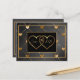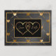 An elegant black and gold wedding Save the Date postcard combining gold hearts and rectangle frames on a black background.
