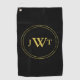 Looking for a personalized gift for a golf lover? The custom monogram is in the centre. The letters are faux (not foil) gold. The monogram is inside of a black circle that has a double border in faux gold.