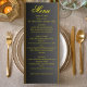 Add a refined and dramatic touch to your wedding reception with this black ombre and gold-look wedding menu template. The sleek black gradient background is perfectly paired with golden yellow text and elegant script font, ideal for formal, black-tie, or evening weddings. Easily customize the names, date, venue, and menu options to make it uniquely yours. A classy and modern accent for your wedding tablescape.
