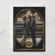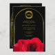 Elegant black and red wedding invitation, featuring a luxurious black background, refined gold typography, and a striking red rose accent. The design is enhanced with a gold arch frame and laurel leaves wreath showcasing the couple’s initials, adding a touch of sophistication and personalization. Perfect for formal, luxury, or black-tie weddings, this invitation is fully customizable with your names, wedding details, photos and monogram.