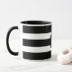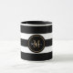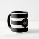 Enjoy your morning coffee in style with this Elegant Black And White Stripes Script Monogram Mug. This classy design has black and white horizontal stripes with black circle border on the front centre. Your monogram is in faux gold minimal lettering and personalized with name in white trendy hand lettered script. Click personalize template option and follow the prompts.