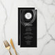 This modern menu features an artistic silver ring design surrounded by light grey wispy brush strokes overlaid on a midnight black background. A great choice for your metro wedding. Add your menu details by clicking the customize link. This is part of a collection with a matching napkins, table number cards and other wedding essentials.