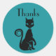 Elegant black cat posing with one paw raised. Has a cute curly tail and is wearing a fancy choker on a Thank you sticker.