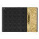 Monogrammed elegant black floral damask pattern and gold sparkling glitter with gold stripe