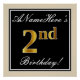 This simple and elegant birthday party poster design features a personalized message like "ANameHere’s 2nd Birthday!" (with the "2nd" having a faux/imitation gold-like colouring look) within a black-coloured square area featuring a simple border outline. The name is in an elegant white-coloured script-like text, and can be personalized. A personalised birthday party poster like this could perhaps be used as a decoration at a party being held for somebody who is celebrating their second birthday. [~Z0000236]