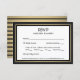Compliment black and gold party invitations with elegant RSVP response cards. All wording on this template is simple to customize or delete as needed. Card includes meal choices and option to reply via website or email. The black, white and gold design features a modern faux foil border, classic stripes, and vintage art deco inspired typography. This announcement note card is a stylish way to request friends and family to RSVP to your upcoming special day celebration. Please note that gold is printed colour, not metallic foil.
