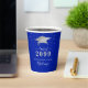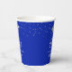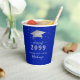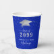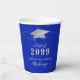 Elegant personalized royal blue and silver graduation party paper cups featuring a faux metallic silver foil graduation cap, silver confetti, fancy calligraphy script typography and class year with CONGRATULATIONS and your graduate's name against an editable royal blue background colour you can change to a school colour or coordinating party theme colour by clicking EDIT. ASSISTANCE: For help with design modification or personalization, colour change, transferring the design to another product or you would like coordinating items, contact the designer BEFORE ORDERING via Zazzle Chat or makeitaboutyoustore@gmail.com.
