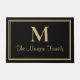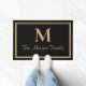 Elegant stylish modern custom monogram doormat in classic black and Gold Double Borders . You can personalize this simple modern black and Gold double borders with your family's last name in script and a serif style monogram initial.