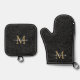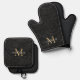 Elegant Black Gold Floral Script Monogram Oven Mitt & Pot Holder Set
