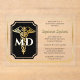 "MD" and a gold-toned caduceus on a black scalloped frame panel on left with your details on right, all surrounded by a gold tone double scalloped-edge frame on a clear background graduation party invitation design that can be personalized for physician's school graduations. Composite design by Holiday Hearts Designs (rights reserved).