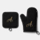 Elegant Black Gold Script Monogram Oven Mitt & Pot Holder Set