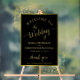Welcome your wedding guests with this beautiful acrylic sign. The stylish design features elegant script calligraphy with delicate swashes or flourishes on the ends of the letters along with your names in gold print on a classic black background. The center text area is surrounded by a transparent border with a golden faux foil frame and delicate floral curls and swirls in the corners. Lovely way to welcome your guests while adding beauty and style to your event.