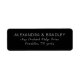 These return address labels feature a sleek, minimalist design with a black background and crisp white text. The layout is centred for a balanced look, utilizing a classic serif font that adds elegance and sophistication. Perfect for formal invitations or announcements, the customizable placeholders allow for personalization while maintaining a professional appearance. The monochromatic colour palette enhances readability and creates a refined atmosphere, making these labels ideal for any special occasion.
