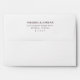 This wedding envelope features a minimalist design with clean lines and ample negative space, creating an elegant and sophisticated look. The layout centers on bold serif typography for the names, followed by a smaller, lighter font for the address, ensuring clarity and readability. With a simple black text on a white background, the color palette emphasizes formality and precision, making it ideal for important announcements or invitations. The absence of decorative elements keeps the focus on the textual content, perfect for couples seeking a classic and timeless style.