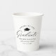 Elegant graduation paper cups featuring a graduation cap with the phrase "Cheers to the Graduate" in a black calligraphy script on a white background. Personalize the modern graduation paper cups with the graduate's name, school name, and graduation year. The design repeats on the back. The simple graduation cups are perfect to use for your high school or college graduation party.