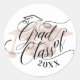 Elegant and classy graduation sticker design featuring the words "Grad Class of" in an elegant classy script style arrangement in black with a graduation cap incorporated into the typographic design and a faux rose blush pink foil graduation cap in the background. Customize with your graduation year.