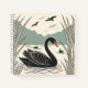 A sophisticated notebook featuring a majestic black swan with detailed feathers and a reddish-orange beak, gliding on calm waters with reeds and smaller swans in the background. Rendered in a muted vintage palette, this timeless design is perfect for journalling, notes, or gifts for nature and bird lovers.