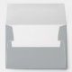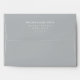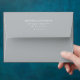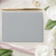 This wedding envelope features a minimalist and elegant design with a solid gray background. The layout is centered, showcasing large, uppercase serif typography for the names at the top, followed by smaller sans-serif fonts for the address and contact information. The clean lines and precise spacing create a modern and sophisticated look, perfect for formal announcements. The use of negative space enhances readability and maintains a balanced visual appeal, making it ideal for couples seeking a refined and uncluttered presentation.