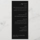 This elegant wedding menu features a sleek black background with crisp white text, creating a sophisticated and modern look. The layout is organized into distinct sections for Starters, Salad, Main Course, and Dessert, each highlighted in clean uppercase sans-serif font. A touch of elegance is added by the cursive script used for the word "MENU" at the top. Perfect for formal events, this design exudes a refined mood, making it ideal for weddings or upscale gatherings.