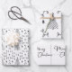 Cute and elegant black and white Christmas tree and Christmas doodles pattern wrapping paper set in modern, minimalist style.