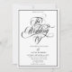 Modern and elegant black and white photo classic wedding invitation. Design featuring deep black background, calligraphy script ''the wedding of'' , and wedding details inside white frame. Add your event details using the template fields provided, then click "customize it" to edit this template. Personalize further with black and white photo on the back.