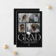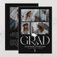 Announce your graduate’s milestone in timeless, sophisticated style with this elegant black and white graduation announcement card. Featuring a trendy black background, the design highlights the word “GRAD” in a modern serif typeface, accented with a stylish graduation cap icon above the “R.” The flowing tail of the “R” transitions into a sleek tassel that connects the graduate’s name, school, and class year, creating a cohesive and high-end finish.