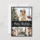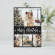 Elegant, Modern 4 Photo Collage Black and White Merry Christmas Script Holiday Card. This festive, minimalist, whimsical, (4) four photo holiday card template features a pretty photo collage, some small snowflake and says Merry Christmas! The „Merry Christmas” greeting text is written in a beautiful white colour hand lettered typography font type on black colour background. On the reverse side with greeting text template on black. Pretty greeting card for your family and friends in this Christmas and Holiday season.