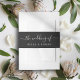 This elegant minimalist wedding invitation belly band boasts modern white script typography on a sleek black background. The sophisticated wrap reads “the wedding of” followed by the couple’s names, creating a timeless and romantic touch. It’s perfect for bundling invitation suites and adding a refined contemporary detail to your wedding stationery.