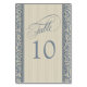 Un élégant design de numéro de table pour les réceptions de mariage, les banquets ou les grands rassemblements. Il présente un joli motif damassé baroque bleu et beige avec une subtile couverture rayée beige contenant le ou les numéros de table des deux côtés. Pour commander un groupe de cartes de table pour votre événement, vous devez créer une carte séparée pour chaque numéro de table. Exemple : Modifiez le numéro de tableau du tableau 1, ajoutez au panier. Modifiez le numéro de tableau du tableau 2, ajoutez au panier...et ainsi de suite jusqu'à ce que vous ayez créé des cartes de table individuelles pour chaque numéro de table dont vous avez besoin.