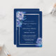 Des roses d'aquarelle bleu et argent spectaculaires et élégants décorent le coin gauche de ce beau faire-part de mariage. Une autre image bleue de rose et de feuille se trouve en bas à droite. Les images sont placées sur un cadre argenté brillant qui entoure votre texte de mariage personnalisé. Le texte et les images sont placés sur un arrière - plan bleu foncé. Le dos de la carte est assorti au bleu solide. Très classe !