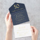 Elegant dark blue 50th birthday party all-in-one invitation featuring "Cheers to 50 Years," your name and invitation details in classic serif typography and clean modern lettering, and a tear-away RSVP response postcard, all rendered in your choice of real gold, silver or rose gold foil.